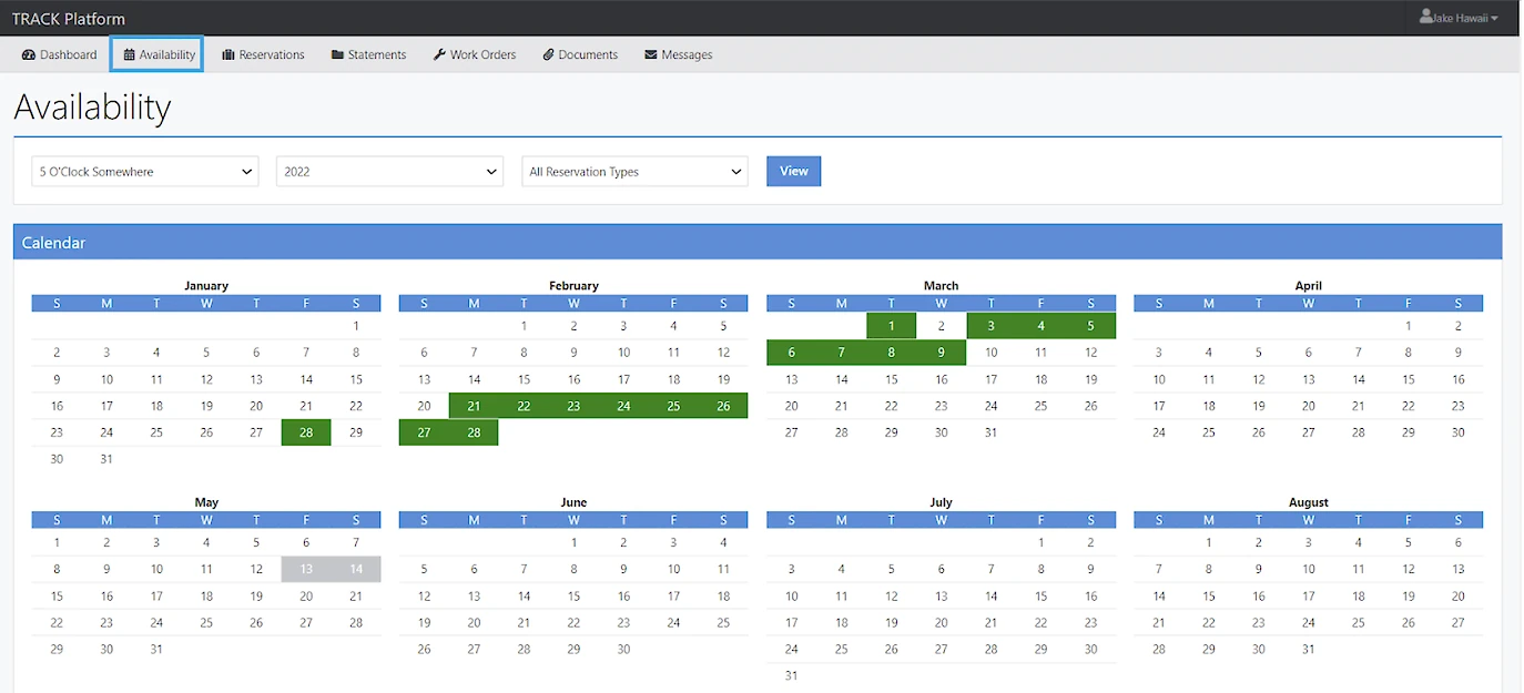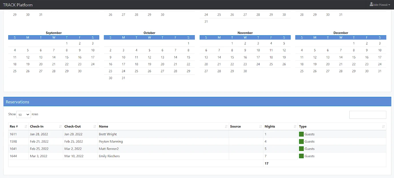 Here, you are provided with Reservations (bookings) across your Unit(s) for the current year (as well as prior years, using the year drop-down), in both a calendar view and list view. Owner bookings will show as black boxes on the calendar.
