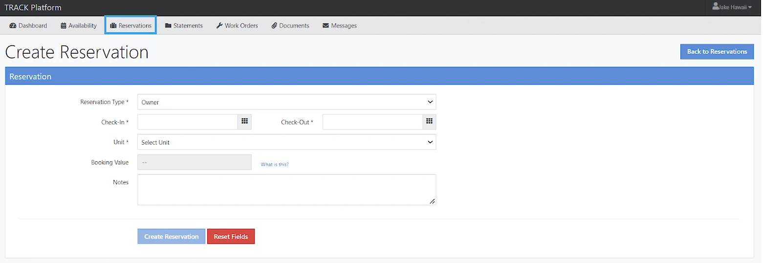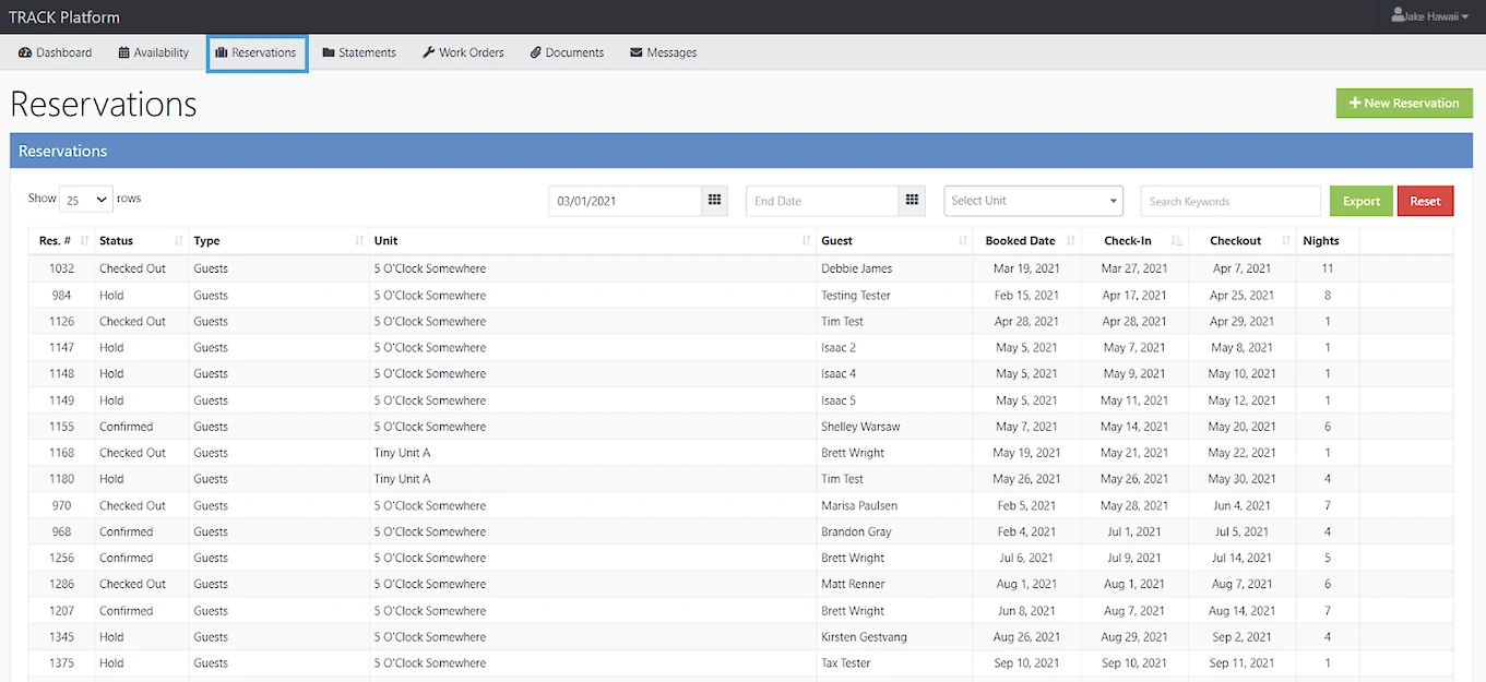 Here, you can see all prior, current, and future Reservations in your Unit(s). You can also create a new booking in your Unit(s), by clicking the green “+New Reservation” button towards the top-right corner.